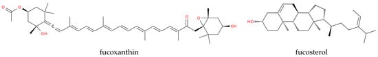 Sulfated galactans are linear polymers with alternating β-D-galactopyranose and α-D-galactopyranose units. Two primary types are identified: carrageenans, which feature a 4-linked α-galactose with a dextro-rotatory (D-) configuration; and agarans, with a levorotatory (L-) 4-linked α-galactose component [75,76,77]. Carrageenan has shown antiviral properties, because of its property of disrupting the interaction between the virus and host cell receptors and preventing viral entry. Iota-carrageenan, a sulfated polysaccharide from seaweed, at low concentrations (4 μg/mL) reduced cell death caused by the SARS-CoV-2 virus, while high concentrations of κ and λ-carrageenans (400 μg/mL) offered only partial suppression, indicating that carrageenan/iota-carrageenan may be more effectively used during the initial stages of infection [78]. An iota-carrageenan nasal spray effectively treated common cold symptoms linked to human coronaviruses, reducing symptom recurrence and improving viral clearance compared to placebo treatments [78]. A nasal spray combining xylometazoline hydrochloride and carrageenan has alleviated nasal congestion and protected the respiratory mucosa from viruses [79]. Lozenges containing iota-carrageenan have inactivated viral glycoproteins in the mouth, blocking viral effects. Iota-carrageenan also neutralized a SARS-CoV-2 spike pseudotyped lentivirus, suggesting its potential efficacy in COVID-19 prevention [80]. Marine-derived saponins from sea cucumbers [81] can boost immunization [82] and could be incorporated into vaccine formulations as adjuvants. Other adjuvants could come from marine lipids found in microalgae that can form stable emulsions that increase the bioavailability of antigens and facilitate their uptake by immune cells [56,59]. Molecules of marine origin could also serve as therapeutics or therapeutic support. For example, infection with several viruses including SARS-CoV-2 infection triggers the release of reactive oxygen species (ROS), increasing susceptibility to further infection. Therefore, marine algae-derived compounds with strong antioxidant properties like fucoxanthin and fucosterol (Figure 1) could counter oxidative damage, reduce overall oxidative stress, and protect immune cells and host tissues during active infection.