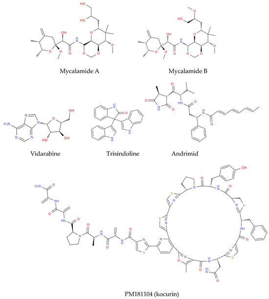 Mycalamide A and Mycalamide B, antiviral compounds derived from a New Zealand sponge (Mycale sp.), were first reported for their antiviral activity in the late 1980s. These compounds also exhibit antitumor properties and inhibit protein synthesis, showcasing activity against murine coronavirus A59, HSV, and polio viruses. Mycalamide A has additionally demonstrated the ability to inhibit influenza virus replication [120]. Vidarabine, a purine nucleoside analogue isolated from the sponge Cryptotethya crypta, gained prominence as one of the first successful antiviral agents licensed in 1977. Despite being largely replaced by acyclovir due to its toxicity and poor solubility, vidarabine remains significant for its effectiveness against herpes simplex virus, cytomegalovirus, and varicella zoster virus (VZV) [121]. It is particularly valuable for treating acyclovir-resistant strains of HSV and VZV and is still used in ophthalmic procedures in the European Union [122]. Trisindoline, identified in extracts of Callyspongia siphonella, is responsible for significant antibacterial and cytotoxic activities. Compounds such as 5-bromotrisindoline and 6-bromotrisindoline were isolated through bioactivity-guided fractionation, exhibiting effective antibacterial properties against S. aureus and Bacillus subtilis [123]. Andrimid, a peptide antibiotic originating from Hyatella sp., displays a broad spectrum of antibacterial activity against both Gram-positive and Gram-negative bacteria, including methicillin-resistant S. aureus (MRSA) and bacterial pathogens including Salmonella enteritidis, Vibrio harveyi, and Yersinia ruckeri [124]. This compound was isolated from a bacterial strain associated with the sponge and has also been sourced from Pseudomonas fluorescens. The widespread occurrence of andrimid among delta-Proteobacteria suggests a role for horizontal gene transfer in its dissemination [125]. PM181104, a thiazolyl cyclic peptide antibiotic derived from the marine sponge Spirastrella inconstans var. digitata exhibits potent antibacterial activity against MRSA and other bacterial pathogens. Characterized by various analytical methods, PM181104 effectively inhibits bacterial protein synthesis and has demonstrated minimal inhibitory concentrations (MIC) against both resistant and sensitive strains of S. aureus and Enterococcus sp. Notably, it has shown non-toxicity to mammalian cell lines, positioning it as a promising therapeutic agent. In in vitro testing against a variety of organisms, PM181104 revealed strong inhibitory action on S. aureus with an MIC range of 0.008 to 2.048 µg/mL, and its efficacy was comparable to that of standard antibiotics in various in vivo models of infection [126]. Aurantoside K, sourced from Melophlus sp., has shown inhibitory activity against various pathogenic fungi, including wild-type and amphotericin B-resistant C. albicans. Its antifungal efficacy extends to Cryptococcus neoformans, demonstrating potential against a range of fungal pathogens [127].
