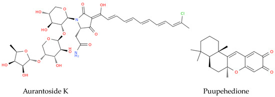 With the term “antimicrobials”, we refer to a broad category of substances that kill or inhibit the growth of microorganisms. This includes antibiotics, antifungals, antivirals, and antiparasitics. Several noteworthy antimicrobials have been identified from marine sources, particularly sponges and their associated bacteria (Figure 4, Table 3).