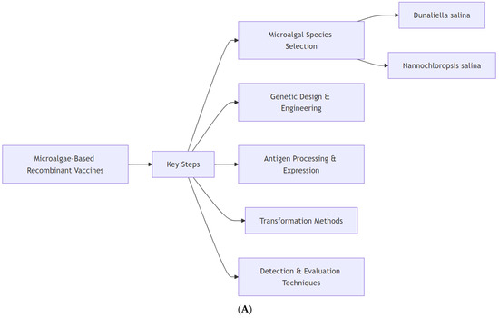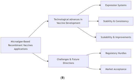 Overview of microalgae-based recombinant vaccines. (A): Fundamental steps in the development of microalgae-based recombinant vaccines begin with the selection of an appropriate microalgal species, often Dunaliella salina and Nannochloropsis salina, which are recognized for their biotechnological potential. Genetic design and engineering define the features of antigen expression and processing and the transformation method. Finally, the expressed antigen is detected, and its vaccine efficacy is detected. (B): Microalgae-based recombinant vaccines have spurred technological innovations in expression systems, improved stability and consistency, and robust scalability and improvements that enhance commercial viability. Microalgae-based technology in vaccine production could provide effective and sustainable solutions for both human and animal health. Regulatory hurdles and possibly low market acceptance represent challenges to overcome that currently limit the widespread adoption of these novel vaccines.