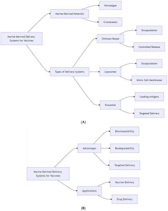 Flowcharts of marine-derived delivery systems for vaccines illustrate the key components and advantages of marine-derived materials used in vaccine delivery systems. (A): Highlights the types of marine-derived materials, including microalgae and crustaceans, and outlines the various delivery systems such as chitosan-based systems, liposomes, and exosomes. It details their specific applications, including encapsulation and controlled release mechanisms. (B): Focuses on the advantages of marine-derived delivery systems, emphasizing biocompatibility, biodegradability, and targeted delivery capabilities. Additionally, it outlines the applications of these systems in both vaccine and drug delivery.