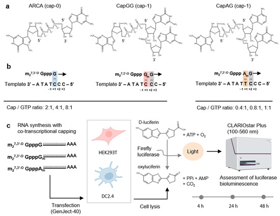 The 5’ cap is a modified N7-methylguanosine connected via a 5′–5′ triphosphate bridge to the first nucleotide of a transcript (m7GpppN). This structure is called cap 0 and in the cell, it plays a key role in several important biological functions. The presence of a cap facilitates transcription initiation, polyadenylation, and splicing [11,12,13,14]. The 5′ cap protects mRNA from degradation by 5′ exoribonucleases and promotes cap-dependent translation (protein synthesis) [14,15,16]. Most often, cap 0 undergoes additional methylation at the 2′-O-ribose position of the first nucleotide in mRNA. This structure is termed cap 1 (m7GpppNm) and additionally serves as a marker for the innate immune system by helping to distinguish viral RNAs from cellular ones [17]. Cytoplasmic functions of the cap are especially important when heterologous mRNAs are used in therapeutics.