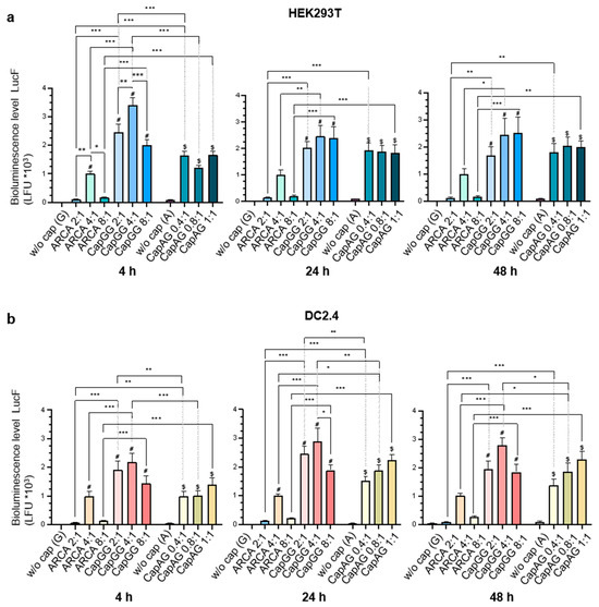 Relative intensity of luciferase bioluminescence in lysates of HEK293T (a) or DC2.4 (b) cells transfected with mRNAs carrying different cap analogs. The measurements were performed at 4, 24, and 48 h after transfection. The bars represent the mean ± SEM of two independent biological replicates, where each independent biological replicate consisted of six independent transfections; the means were normalized to ARCA-capped RNA. Statistical significance: * p < 0.05, ** p < 0.01, *** p < 0.001, (two-way ANOVA with Bonferroni’s adjustment); # a significant difference between the control and experimental samples for ARCA and CapGG groups; $ for the CapAG group.