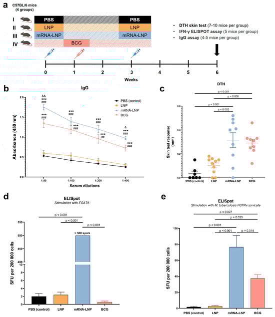 T- and B-cell immune responses after vaccination of C57BL/6JCit mice. Groups I, II, and III received two injections, three weeks apart: PBS buffer for Group I, LNP for Group II, and mRNA-LNP for Group III. Group IV received a single injection of BCG. (a) Experimental design of the in vivo experiments. (b) Plasma IgG antibody binding to mycobacterial antigens. Serum dilutions of 1:50 to 1:400 were used. (c) The DTH reaction: differences (∆) between the right and left paw at 48 h after injection of 50 IU of tuberculin. The IFN-γ ELISpot response from vaccinated mice stimulated with (d) ESAT6 or (e) the M. tuberculosis sonicate. SFU: spot-forming units. The data are presented as mean ± standard error. p values in panels (b–e) were determined by one-way ANOVA with Bonferroni’s post hoc test. *** p < 0.001 as compared with the PBS group; ## p < 0.01, ### p < 0.001 as compared with the LNP group; & p < 0.05 and && p < 0.01 as compared with the BCG group.