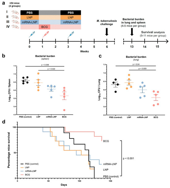 The evaluation of protective immune responses after vaccination of I/St mice. Groups I, II, and III received two injections, three weeks apart: PBS buffer for Group I, LNP for Group II, and mRNA-LNP for Group III. Group IV received a single injection of BCG. (a) Experimental design. Bacterial load assessed as CFUs in lung (b) and spleen (c) homogenates at 7 weeks post-challenge; (d) Kaplan–Meier survival curves. The data are presented as mean ± standard error. p values in panels b and c were determined by one-way ANOVA with Bonferroni’s post hoc test.