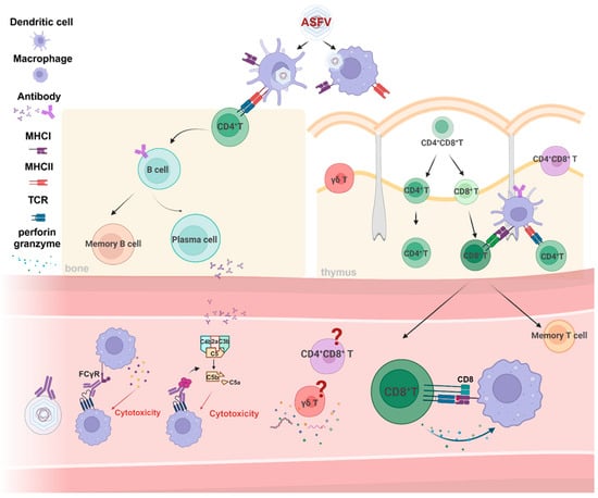 Adaptive immune responses during ASFV infection. ASFV has a significant impact on the adaptive immune response, including both humoral and cellular immunity, effectively evading immune clearance and inhibiting immune memory. B and T lymphocytes are the primary cells involved in these responses. B cells, particularly plasma cells, produce virus-specific antibodies—both neutralizing and non-neutralizing—that can neutralize antigens and trigger complement-dependent cytotoxicity as well as antibody-dependent cellular cytotoxicity. Among T cells, CD8+ T cells, including cytotoxic T lymphocytes, and CD4+ CD8+ double-positive (DP) T cells, play crucial roles. CD4+ T cells function as helper T cells, assisting in antigen presentation by antigen-presenting cells. However, ASFV infection leads to a reduction in the overall population of B cells and a decrease in CD4+ and CD8+ T cells. The proportions of DP T cells and CD4+ and CD8+ T cells can vary depending on the virulence of the ASFV strain, with the role of DP T cells during ASFV infection remaining poorly understood. Notably, pigs have a high frequency of circulating γδ T cells, which have been shown to present ASFV antigens to specific T cells in ASFV-immune pigs. However, the functional properties of these γδ T cells warrant further investigation.Created with BioRender.com.