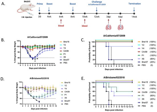 Schematic of animal study. (A) Animal study outline: Eighty-eight BALB/c mice (n = 11) were intramuscularly vaccinated with COBRA or wild-type HA VLP vaccines formulated with AddaVax adjuvant at weeks 0, 4, and 8. At weeks 6 and 10 post vaccination, blood was collected, and the sera were separated for analysis. At week 12, all mice were inoculated with 5 × 104 PFU of A/California/07/2009 H1N1 virus intranasally, lung tissues (n = 3/group) were harvested on days 3 and 6 post infection and evaluated for histopathology and virus titration. (B) Body weight loss of mice post infection: The mice were observed for clinical signs for 14 days, and their body weight was recorded daily post infection. The dotted line indicates 80% of their body weights on D0 post infection. (C) Survival cure after infection with A/California/07/2009 virus. Another 64 DBA/2J mice were intramuscularly vaccinated with COBRA or wild-type rHA vaccines formulated with AddaVax adjuvant using the same vaccination regimen mentioned above. At week 12, all mice were intranasally infected with 8.75 × 106 PFU of A/Brisbane/02/2018 H1N1 virus. (D) Body weight loss curve of DBA/2J mice after infection with A/Brisbane/02/2018 H1N1 virus. (E) Survival cure after infection with A/Brisbane/02/2018 virus.