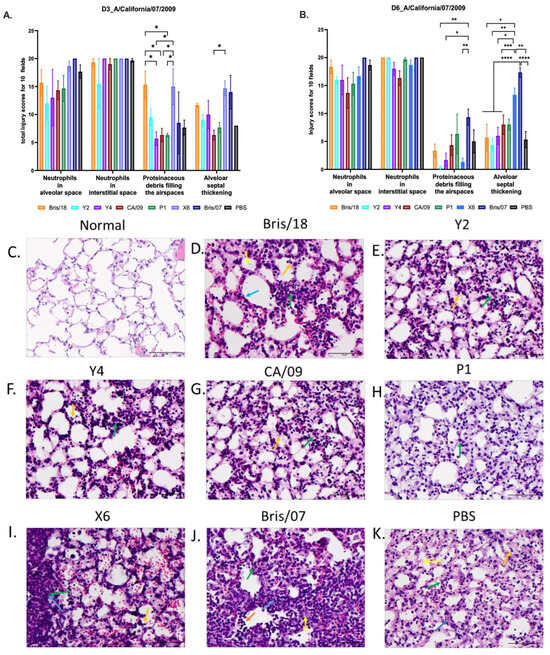 Lung injury in mice after A/California/09/2007 virus infection. Three mice from each group were euthanized on day 3 (A) and day 6 post infection (B). The left lungs were inflated with 10% buffered formalin and then embedded into paraffin blocks. H&E staining was performed on 3 sectional slides for each mouse lung sample. Neutrophils in alveolar space, neutrophils in interstitial space, proteinaceous debris filling the airspaces, and alveolar septal thickening were assessed. Each parameter was evaluated in 10 random fields under 40× magnification (scale bar indicated 50 µm), and then, the total injury scores of 10 fields were determined. Scoring system: Neutrophils in alveolar space (indicated with orange arrows): 0 = none, 1 = 1–5, 2 = >5; neutrophils in interstitial space (indicated with green arrows): 0 = none, 1 = 1–5, 2 = >5; proteinaceous debris filling the airspaces (indicated with yellow arrows): 0 = none, 1 = 1, 2 = >1; alveolar septal thickening (indicated with blue arrows): 0 = <2×, 1 = 2×–4×, 2 = >4×. (C) Normal mouse left lung (no vaccination or infection). (D–K) Representative images of alveolar septal thickening on day 6 post infection in mice vaccinated with (D) Bris/18, (E) Y2, (F) Y4, (G) CA/09, (H) P1, (I) X6, (J) Bris/07, and (K) PBS. The data are presented as absolute mean plus SEM. A one-way ANOVA was used to analyze the statistical differences of the lung injury scores using GraphPad Prism 9 software (GraphPad, San Diego, CA, USA). A p value less than 0.05 was defined as statistically significant (*, p < 0.05; **, p < 0.01; ***, p < 0.001; ****, p < 0.0001).