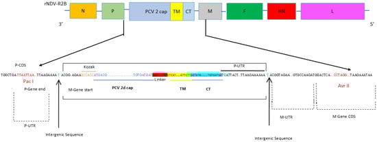 Schematic diagram showing the construction of pNDV-R2B infectious clone harboring the cap gene PCV2. The transcription cassette of PCV2 cap gene was connected with a GS linker to the transmembrane domain and cytoplasmic tail (TMCT) of the F protein of NDV and cloned between the P and M genes that are flanked by Pac I and Avr II restriction sites. P CDS: P gene coding sequence; P-UTR: P gene non-coding region; M-UTR: M gene non-coding region; M Gene CDS: M gene coding sequence.