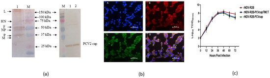 The growth kinetics of rescued viruses rNDV-R2B-PCVcap, rNDV-R2B-PCVcap-TMCT, and rNDV-R2B were studied using a multistep growth curve analysis in Vero cells. Viruses were inoculated at an MOI of 0.01 into Vero cells cultured in six-well plates at 37 °C. Supernatants were collected every 12 h over 72 h, and viral titres were measured using the median tissue culture infective dose (TCID50) method. Through fluorescence assay, the recombinant virus (0.01 MOI) infected Vero cells were visualized after 48 h of infection using a Fluroview FV100 confocal microscope (Olympus, Tokyo, Japan), as described [19]. Both the recombinant viruses containing the cap gene of PCV2 were purified using ultra-centrifugation method, as described previously [20]. Through Western blotting, the purified virus was characterized for the presence of NDV and cap protein of PCV2 using anti-NDV polyclonal sera (Abcam, Cambridge, MA, USA) and anti-PCV2 polyclonal antibody (GeneTex, Irvine, CA, USA).