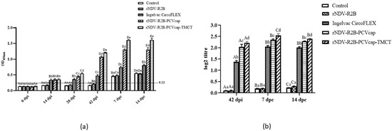 Estimation of PCV2-specific antibodies was studied at 0, 14, 28, and 42 dpi, and at 7 and 14 dpc by ELISA (Figure 3a). The rNDV-R2B-PCVcap-TMCT group showed significantly higher antibody titres from 28 dpi onwards compared to rNDV-R2B-PCVcap and the Ingelvac CircoFLEX groups, while unvaccinated control and rNDV-R2B groups remained low. At 7 and 14 dpc, the rNDV-R2B-PCVcap-TMCT group showed the highest antibody response, followed by rNDV-R2B-PCVcap and Ingelvac CircoFLEX, while the unvaccinated control and rNDV-R2B groups showed minimalistic responses.