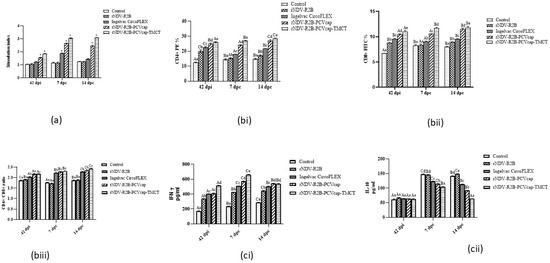 In the lymphocyte proliferation test, the PCV2 cap protein-specific lymphocyte proliferation was significantly higher at 42 dpi, and 7 and 14 dpc, in the vaccinated compared to control and rNDV-R2B groups (Figure 4a). The rNDV-R2B-PCVcap-TMCT and rNDV-R2B-PCVcap groups demonstrated the highest antigen-specific cell proliferation, followed by the Ingelvac CircoFLEX group, while the control and rNDV-R2B groups showed significantly lower values (p < 0.05).