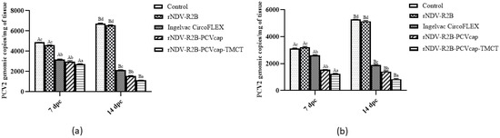 Quantification of viral load, at 7 and 14 dpc in lungs (Figure 5a) and inguinal lymph node (Figure 5b) using real-time PCR demonstrated that the rNDV-R2B-PCVcap-TMCT group had the lowest PCV2 genomic copies (p < 0.05) when compared to other groups, followed by rNDV-R2B-PCVcap and Ingelvac CircoFLEX groups (p < 0.05). The control and rNDV-R2B groups had the highest viral loads, with levels significantly increased at 14 dpc.