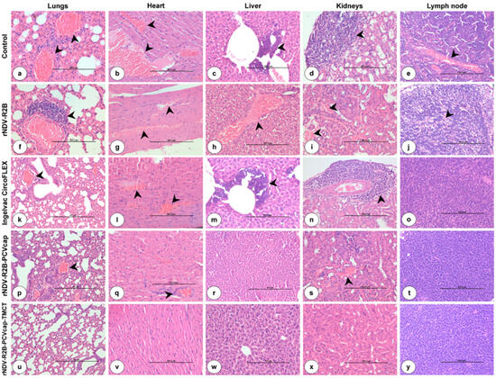 Histopathological lesions in internal organs of mice at 14 days post challenge (dpc). Control (a–e), rNDV-R2B (f–j), Ingelvac CircoFLEX (k–o), rNDV-R2B-PCV (p–t), and rNDV-R2B-PCV-TMCT (u–y). (a) Lungs showed interstitial pneumonia with thickening of interalveolar spaces and marked congestion (arrow). H&E ×20. (b) Heart showed marked dilatation and congestion of myocardial blood vessels (arrow). H&E ×20. (c) Liver showed marked infiltration of inflammatory cells in portal triad (arrow). H&E ×20. (d) Kidneys showed marked infiltration of mononuclear cells (arrow). H&E ×20. (e) Lymph node showed congestion of blood vessels in cortex (arrow). H&E ×20. (f) Lungs showed moderate perivascular infiltration of lymphoid cells (arrow). H&E ×20. (g) Heart showed moderate to marked congestion of blood vessels (arrow). H&E ×20. (h) Liver showed marked congestion of blood vessels (arrow). H&E ×20. (i) Kidneys showed congestion and hemorrhages (arrow). H&E ×20. (j) Lymph node showed marked lymphoid depletion in cortex (arrow). H&E ×20. (k) Lungs showed mild to moderate thickening of interalveolar spaces and congestion (arrow). H&E ×20. (l) Heart showed mild to moderate congestion of myocardial vessels (arrow). H&E ×20. (m) Liver showed moderate infiltration of inflammatory cells in portal triad (arrow). H&E ×20. (n) Kidneys showed moderate infiltration of mononuclear cells (arrow). H&E ×20. (o) Lymph node showed mild lymphoid hyperplasia. H&E ×20. (p) Lungs showed mild congestion (arrow) and thickening of interalveolar spaces. H&E ×20. (q) Heart showed mild congestion of blood vessels (arrow). H&E ×20. (r) Liver showed mild congestion. H&E ×20. (s) Kidneys showed mild congestion (arrow). H&E ×20. (t) Lymph node showed moderate lymphoid hyperplasia. H&E ×20. (u) Lungs showed normal alveoli lined by flattened squamous type I pneumocytes. H&E ×20. (v) Myocardium showed normal branching cardiac fibers. H&E ×20. (w) Liver showed normal central vein with radiating cords of hepatocytes. H&E ×20. (x) Kidneys showed normal glomeruli and renal tubules in cortex. H&E ×20. (y) Lymph node showed marked lymphoid hyperplasia in cortex. H&E ×20.