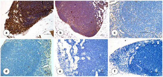 Demonstration of PCV2 antigen in inguinal lymph node of mice at 14 days post challenge (dpc). (a) Unvaccinated and infected control group showed marked (+++) immunolocalization of PCV2 antigen. (b) rNDV-R2B group showed moderate (++) to marked (+++) immunolocalization of PCV2 antigen. (c) Ingelvac CiroFLEX group showed moderate (++) immunolocalization of PCV2 antigen. (d) rNDV-R2B-PCVcap group showed mild (+) immunolocalization of PCV2 antigen. (e) rNDV-R2B-PCVcap-TMCT group showed absence of immunolocalization of PCV2 antigen. (f) Negative control showed no positive immunoreaction for PCV2 antigen. IP-DAB-MH ×20.