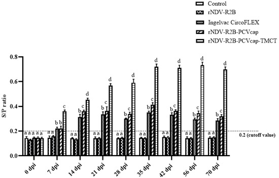 Sera samples from all five groups of pigs were screened for PCV2-specific antibodies over 70 dpi. At 0 dpi, all groups tested negative for antibodies by ELISA. By 7 dpi, seroconversion was detected in the rNDV-R2B-PCVcap-TMCT, rNDV-R2B-PCVcap, and Ingelvac CircoFLEX groups (p < 0.05), while the control and rNDV-R2B groups remained negative. By 14 dpi and until 70 dpi, the rNDV-R2B-PCVcap-TMCT group had the highest antibody titres, followed by rNDV-R2B-PCVcap and Ingelvac CircoFLEX. The control and rNDV-R2B groups showed values below the cutoff S/P ratio (Figure 8).