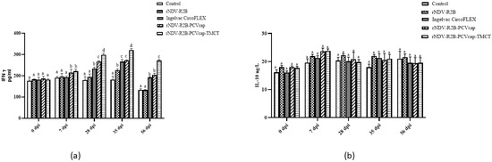 For IL-10 levels, all groups exhibited similar baseline levels (15–18 ng/L) at 0 dpi. By 7 dpi, IL-10 levels increased slightly across all groups, with no significant differences. At 28, 35, and 56 dpi, IL-10 levels were slightly elevated but showed minimalistic variation between groups (Figure 9b).