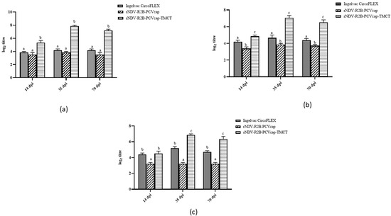 Neutralization antibody titres in the experimental pigs against PCV2 genotypes. Sera collected from vaccinated pigs at 14, 35 and 70 dpi were neutralized with (a) PCV2d genotype; (b) PCV2b genotype and (c) PCV2a genotype. Bars (Mean ± SE) indicate the representative data of a single experiment. Data with different small letters superscript indicate treatment effect (p < 0.05).