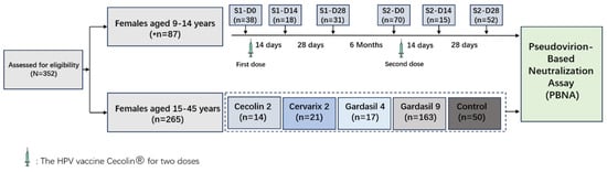 Study design. This is a study that combines longitudinal and cross-sectional analysis, including samples of females aged 9–14 years and females aged 15–45 years who received four types of HPV vaccines. A total of 352 participants and 489 corresponding serum samples were included in this study. * Not all the girls were included before the first dose; some were included before the second dose.