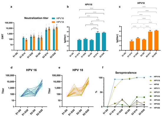 Comparisons of HPV-type NAbs across different stages of the cohort. (a) The HPV16 and 18 NAb GMTs with 95% CI of the girls in different stages. (b) The HPV16 and (c) HPV18 NAb mean lg (titer) with 95% CI and significant difference comparisons. (d) The trend in HPV16 and (e) HPV18 NAb titers among the 19 girls who completed the primary follow-up timepoints. (f) The seroprevalence of HPV-type NAbs of the girls vaccinated with Cecolin 2 throughout the whole follow-up. To better illustrate the pattern of trends, the negative points (titer < 40) of S1 are represented by 40 in (d,e). The negative samples are not included in the PBNA-GMT. PBNA NAbs’ positive reference value: titer ≥ 40. The gray dots represent individual participant titers; bars depict geometric mean titers with exact 95% confidence intervals. GMT: geometric mean titer. Lg (titer): log-transformed titer. *: p < 0.05; ****: p < 0.0001. Considering the use of the multiple comparisons test, the p values have been adjusted (the family-wise alpha threshold and confidence level were 0.05 and 95%, same below).