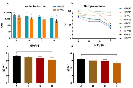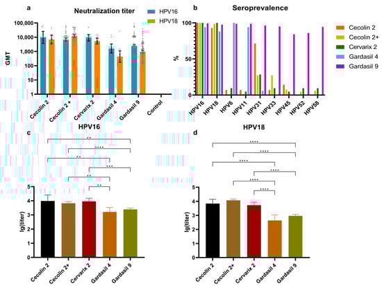 Groups were compared using Bonferroni’s multiple comparisons test as appropriate. p values less than 0.05 were considered significant. All statistical tests were two-sided. HPV-type-specific seroprevalence (percentage of neutralization-positive serums among all serums) and geometric mean titers (GMTs, neutralization-positive serums only) with 95% confidence intervals (95% CIs) were calculated using GraphPad Prism 9. All statistical analyses with significant differences in figures in this study are presented in Supplementary Table S1.
