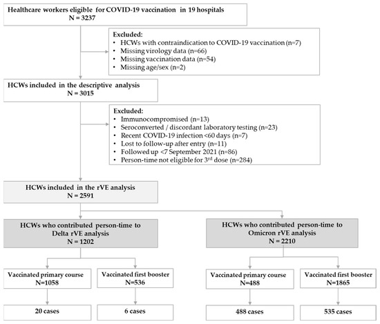 To estimate rVE, we compared hazard rates of SARS-CoV-2 infections among HCWs who were vaccinated with the first booster dose and those of HCWs vaccinated with primary course alone. The rVE analysis was possible for the Delta and Omicron waves only, as the first booster vaccination started to be recommended in September 2021. For this analysis, we excluded HCWs with immunocompromising conditions for whom a three-dose primary course vaccination was recommended and those with recent SARS-CoV-2 infection (<60 days). Participating HCWs that presented serologic evidence of infection during the study (anti-N testing performed in seven sites) not concordant with the virology testing were also excluded from the rVE analysis. In addition, we excluded HCWs who did not respond to enrolment or any follow-up questionnaires, and those with missing or incompatible information in age, sex, or vaccination status. We also excluded person-time if more than one virology test was missed (based on site testing frequency), and we considered an HCW lost to follow-up if more than two tests were missed. The rVE analyses were restricted to complete data.