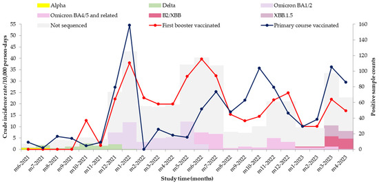 We calculated the incidence of SARS-CoV-2 infection as the number of events reported during the person-time at risk. Each participant began contributing person-time at risk from the date of enrolment, 60 days after a PCR-confirmed SARS-CoV-2 infection if positive at or before enrolment, or 14 or more days after completion of a primary vaccination course, whichever was the latest. Person-time at risk ended at SARS-CoV-2 infection (the date of either the first positive RT-PCR test or first onset of symptoms, whichever was earlier), the date of end of the study for the participant, loss of follow-up, or censor date (2 May 2023).