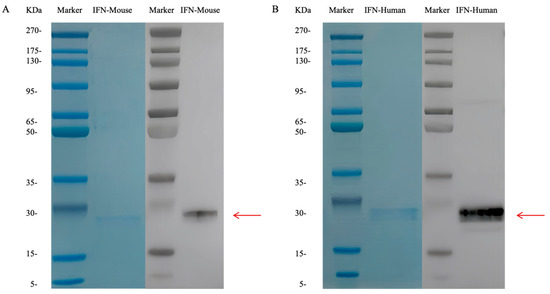 Schematic diagram of HEK293 cells expressing two IFN proteins. SDS-PAGE and Western blot were used to confirm that the protein sizes of (A) IFN-Mouse and (B) IFN-Human were accurate.