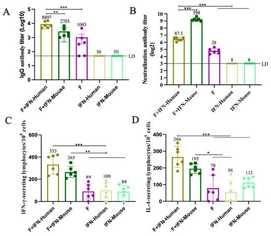 Using a plaque reduction neutralization test, the neutralizing-antibody titers produced in BALB/c mice after secondary immunization and challenge were compared. As shown in Figure 2B, both the F + IFN-Human and F + IFN-Mouse experimental groups induced higher levels of neutralizing antibodies in mice compared to the control groups (F, IFN-Human, IFN-Mouse). The F + IFN-Mouse experimental group induced higher neutralizing-antibody titers than the F + IFN-Human experimental group, with significant statistical differences (p < 0.001).