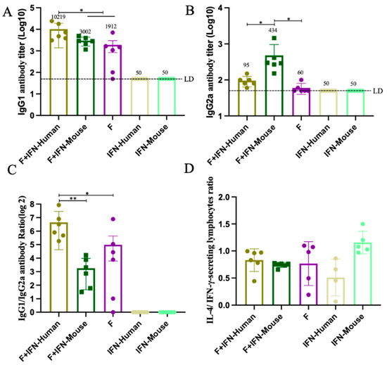 Bias of induced immune response in mice after immunization: (A) The antibody level of serum specific IgG 1 after immunization; (B) the serum specific IgG 2a antibody level of mice after immunization. The data represent the geometric means ± SD, LD indicates the limit of detection, which is half of the lowest dilution of serum, and for this experiment, LD = 50; (C) the ratio of serum-specific antibody IgG 1 to IgG 2a after immunization; (D) the ratio of cytokine IL-4/IFN-γ secreted by spleen lymphocytes of mice after immunization; statistically significant differences were measured by appropriate one-way ANOVA (* p < 0.05; ** p < 0.01).