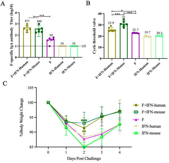 RT-PCR was used to detect the viral lung load in mice after the challenge. As shown in Figure 4B, the reduction in viral lung load in the experimental groups F + IFN-Human and F + IFN-Mouse was greater than that in the control group (F), with significant statistical differences (p < 0.05, p < 0.001). Additionally, the reduction in viral lung load in the F + IFN-Mouse experimental group was greater than in the F + IFN-Human experimental group, with a significant statistical difference (p < 0.001).