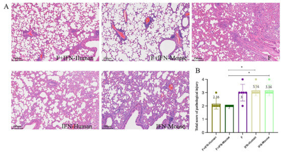 On the fourth day after BALB/c mice were infected with HRSV, their left lungs were collected, stained with hematoxylin and eosin, and analyzed for the degree of lung pathological damage. Pathological scoring was performed as described in the methods. As shown in Figure 5B, the degree of lung pathological damage in the experimental group F + IFN-Mouse (total pathological injury score of 2) was lower than that in the control groups (IFN-Human and IFN-Mouse, with a total pathological injury score of 3.16), with statistical significance (p < 0.05). There was no statistical difference between the experimental groups (F + IFN-Human and F + IFN-Mouse).
