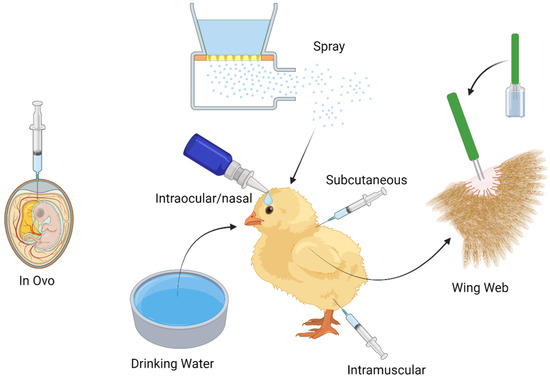 Effective poultry vaccination has become a challenge around the world due to the increase in demand for poultry meat and eggs, leading to more flocks and larger flock sizes. Vaccination has become more popular to carry out in the hatchery, where mass vaccination can be administered in ovo at embryo day 18–19, or by spray on the day of hatching. Vaccines can also be administered individually on the day of hatching via intramuscular or subcutaneous injection and intraocularly/nasally (Figure 1). Once at the farm, further vaccination can occur via spray, drinking water application, or wing web as well as intramuscular or subcutaneous injection (Figure 1). Although individual vaccination of animals is thought to be more effective, as all birds are vaccinated with the same known dose of antigen, it is becoming impractical due to the increasing number of commercial chickens worldwide.