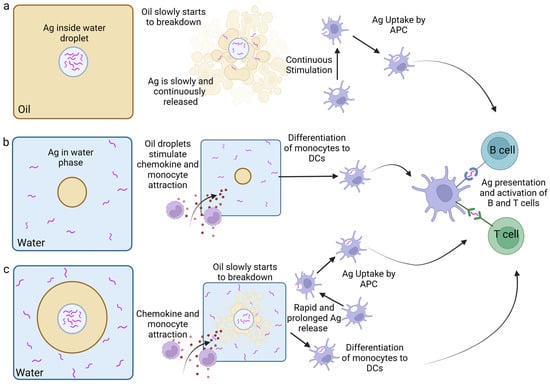 Illustration of different types of oil emulsions. (a) Water-in-oil emulsion (W/O). This method traps the antigen (Ag) inside water droplets. This protects the structure of the Ag, allowing for slow antigen release due to the breakdown of the oil. This prevents rapid clearance of the antigen, which allows for increased immune cell recruitment and antigen processing. (b) Oil-in-water (O/W) emulsion. Here, the oil helps attract monocytes and chemokines to the injection site. This promotes the differentiation of monocytes into dendritic cells (DCs) and stimulates a strong cellular immune response. (c) Water in oil in water (W/O/W). Here, the antigen is in both the oil and water phases, so the antigen is both taken up quickly from the water phase but also slowly released from the internal water phase. The breakdown of the oil also helps with the attraction of monocytes and chemokines to help induce a strong cellular immunity. Created with BioRender.com.