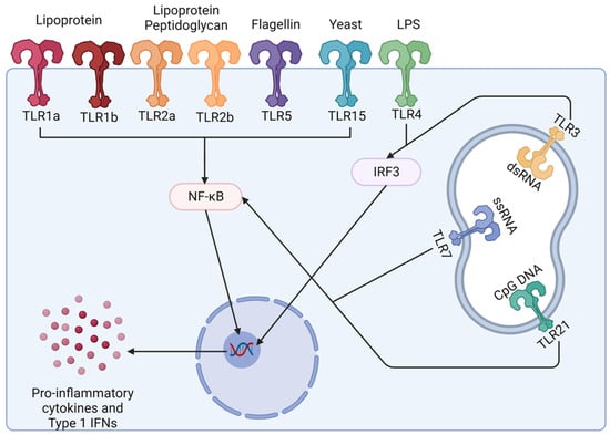 Toll-like receptors (TLRs) are membrane-anchored receptors that are expressed in macrophages and dendritic cells and initiate host defence mechanisms upon recognising specific components of microbes. Once TLRs are activated, they have an important role in the proinflammatory response, and they contribute to the production of antigen-specific immunity by inducing the expression of cytokines involved in T-cell differentiation, and so, induce cell-mediated responses which, in turn, support the humoral immune response [80,91]. There are 10 known TLRs in chickens, and the use of TLRs as adjuvants in vaccines has shown promising results in several animal models, including poultry (Figure 3) [91,92].