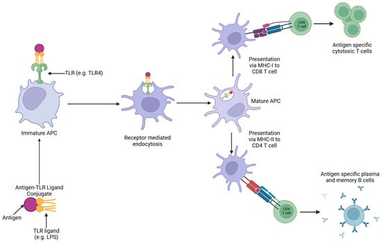 In ligand-based APC-targeting vaccines, the antigen is conjugated to a specific PRR ligand, which results in an antigen–PRR ligand conjugate vaccine. This is then recognised by the associated TLR on an APC and ensures the antigen is processed and then presented via the APC (Figure 5). This increases vaccine potency as it increases antigen presentation and cellular stimulation, resulting in improved associated humoral and cellular immunity [8].