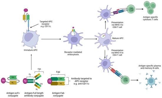 Antigen-presenting cells (APCs) are a crucial part of the innate immune system and play an essential role in initiating the adaptive immune response. APCs such as dendritic cells (DCs) can induce the activation and clonal expansion of T cells. Therefore, targeting APCs via vaccination can help induce effective and long-term T-cell-based immune responses. The uptake of antigens by APCs using antigen targeting has been developed for use in humans to increase the potency of vaccines and immunotherapy treatments over the last two decades, especially to tackle cancer and autoimmune conditions [107].