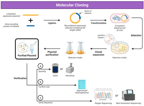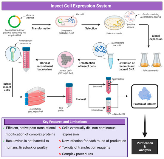 E. coli is the most commonly used bacterial system for protein expression due to its simplicity in being able to use a plasmid encoding the gene of interest to transform the bacteria and the simple production and efficiency of producing protein (Figure 1 and Figure 2) [31,32,33,34,35]. The majority of viral glycoproteins are large proteins (greater than 60 kDa) that are difficult to express using E. coli. Though it has been shown that E. coli strains such as SHuffle [32] and other strains [33] can produce disulphide bonds in expressed proteins, a lack of post-translational machinery and protein expressed in inclusion bodies make E. coli expression not suitable for many viral glycoproteins [34].