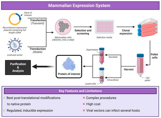 Mammalian protein expression systems have been modified and optimized over the past twenty years with Chinese hamster ovary (CHO), human embryonic kidney (HEK) and NS0 murine myeloma being the most preferred cell lines (Figure 4) [113]. The advantage to using mammalian cell lines is the requirement for post-translational modifications and the biosynthetic complexity of the proteins of interest [114]. Mammalian cells are more likely to express properly folded proteins with native post-translational modifications. Glycosylation patterns of mammalian-expressed secreted proteins are similar with those observed in vivo with minor differences between species of cell hosts [115,116]. For the expression of the protein of interest, this can be achieved by either transient expression using a plasmid or the generation of a stable cell line using lentiviral vectors. Unfortunately, most mammalian expression systems require using serum to support the growth of the cells, which is costly and requires additional safety testing of the serum used.