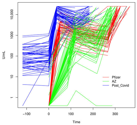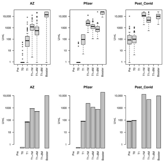 The levels of antibodies were quantified at baseline (day of first dose = T0) and three weeks after the first vaccination for the Pfizer-BioNTech vaccine group (day of second dose = T1); at baseline (day of first dose = T0) and three months after the first vaccination for the AZ vaccine group (day of second dose = T1); at baseline (day of first dose = T0) for the Post-COVID group (only one dose); and during the respective follow-up (Table 1).