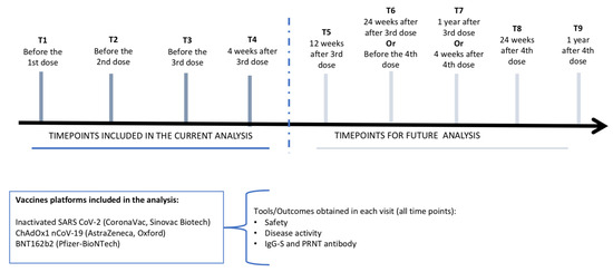Additionally, the date, location, vaccine type, vaccination schedule and indication were recorded. Blood samples were taken for immunogenicity analysis. Adverse events, disease flare-ups, and any new immune-mediated manifestations associated with the vaccines were also documented.