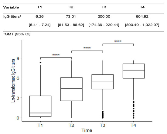 Humoral response was evaluated four times: at baseline (T1) and 28 days after the first (T2), 2nd (T3) and 3rd (T4) doses. The results were presented as geometric mean IgG titers (GMT) and seroconversion rate. Comparisons between groups and times were performed using the non-parametric Wilcoxon/Mann–Whitney test, using the value of the natural log + 1 of IgG (ln-transformed). In paired comparisons by time, the Bonferroni correction for multiple comparisons was also used.
