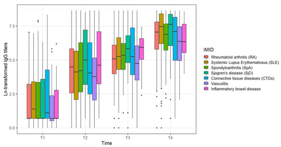 Additionally, stratified analyses and the comparison between IgG titers in each disease group were obtained (Table 3, Figure 4). Vasculitis, inflammatory myositis, systemic sclerosis, inflammatory bowel disease and spondyloarthritis showed a lower humoral immune response compared to Sjögren’s disease and systemic lupus erythematosus (Supplementary Table S2).