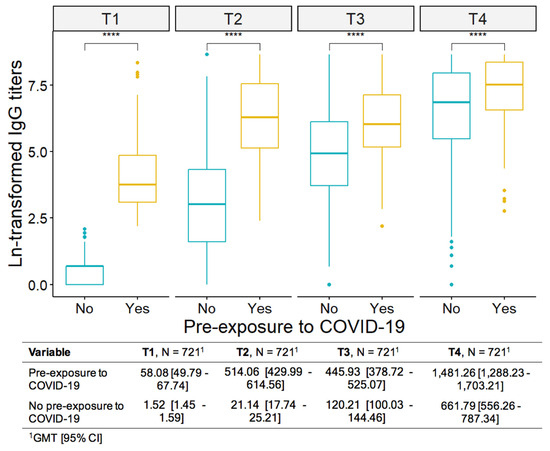 IgG-S antibody titers according to pre-exposure or non-exposure to COVID-19. T1: at baseline; a T2: 28 days after the first; T3: 28 days after the 2nd; T4: 28 days after the 3rd dose. GMT: geometric mean; CI: confidence interval. The results were presented as geometric mean IgG titers (GMT). **** p ≤ 0.0001.