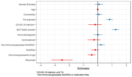 Moreover, the multivariate linear regression showed that greater titers of IgG antibodies were also associated with pre-exposure to COVID-19 (p < 0.001) and BNT162b2 booster regimens (p < 0.001). Pre-exposure to COVID-19 and BNT162b2 booster vaccines were independent predictors of better humoral immune response. Rituximab and immunosuppressant drugs were independent factors for lower titers (p = 0.002, p < 0.001, respectively). Table 5 and Figure 6.