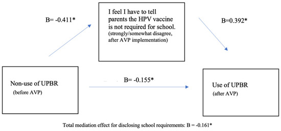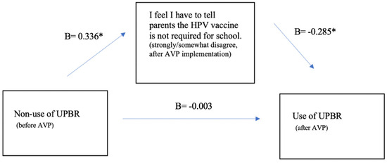 Three variables were selected for use in the mediation analyses. The predictor variable was non-use of UPRs at baseline, and the dependent variable was use of UPBR at follow-up (see Section 2.3.3. for detail about construction of UPBR use and UPBR non-use). In other words, the mediation model sought to identify variables that explained why pediatricians who did not use UPBRs at baseline changed to using UPBRs after AVP implementation. Out of the 34 psychosocial variables, only one variable met the criteria for use as a mediator in the model (see Section 2.4 for selection criteria). This variable was pediatricians’ agreement with the statement, “I feel I have to tell parents the HPV vaccine is not required for school”. Responses ranged from 1 = “strongly disagree” and 4 = “strongly agree”. Disagreement with this statement (strongly disagree and somewhat disagree) at the follow-up survey (after AVP implementation) was entered into the model as a mediator.