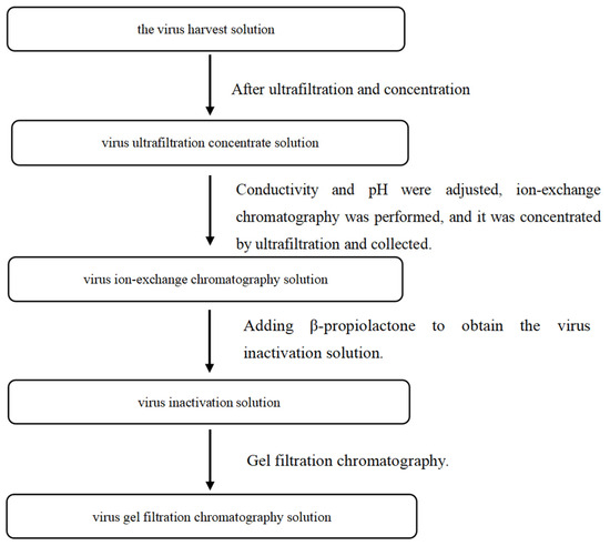 Two batches of human rabies vaccine were produced according to the established process, and the intermediates from each batch were collected, including the rabies virus CTN-1V harvest solution, virus ultrafiltration concentrate solution, virus ion-exchange chromatography solution, virus inactivation solution, and virus gel filtration chromatography solution. The process steps are shown in Figure 1.
