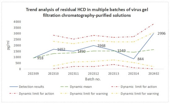 The detection results and trend analysis of residual HCD in multiple batches of virus gel filtration chromatography-purified solutions are presented in Table 4 and Figure 4, respectively. The results show that, although the residual HCD level of the virus gel filtration chromatography-purified solution fluctuated among different batches, the detection results of all batches were within the dynamic warning limit, and, after conversion, the detection results of all batches met the approved quality standard (<2 ng/dose).