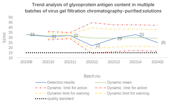 Table 5 and Figure 5 present the detection results of glycoprotein antigen content in multiple batches of virus gel filtration chromatography-purified solutions. Although the glycoprotein antigen content fluctuated between batches, the detection results of all batches were within the dynamic warning limits, and the detection results of all batches far exceeded the approved quality standard (15 IU/mL).