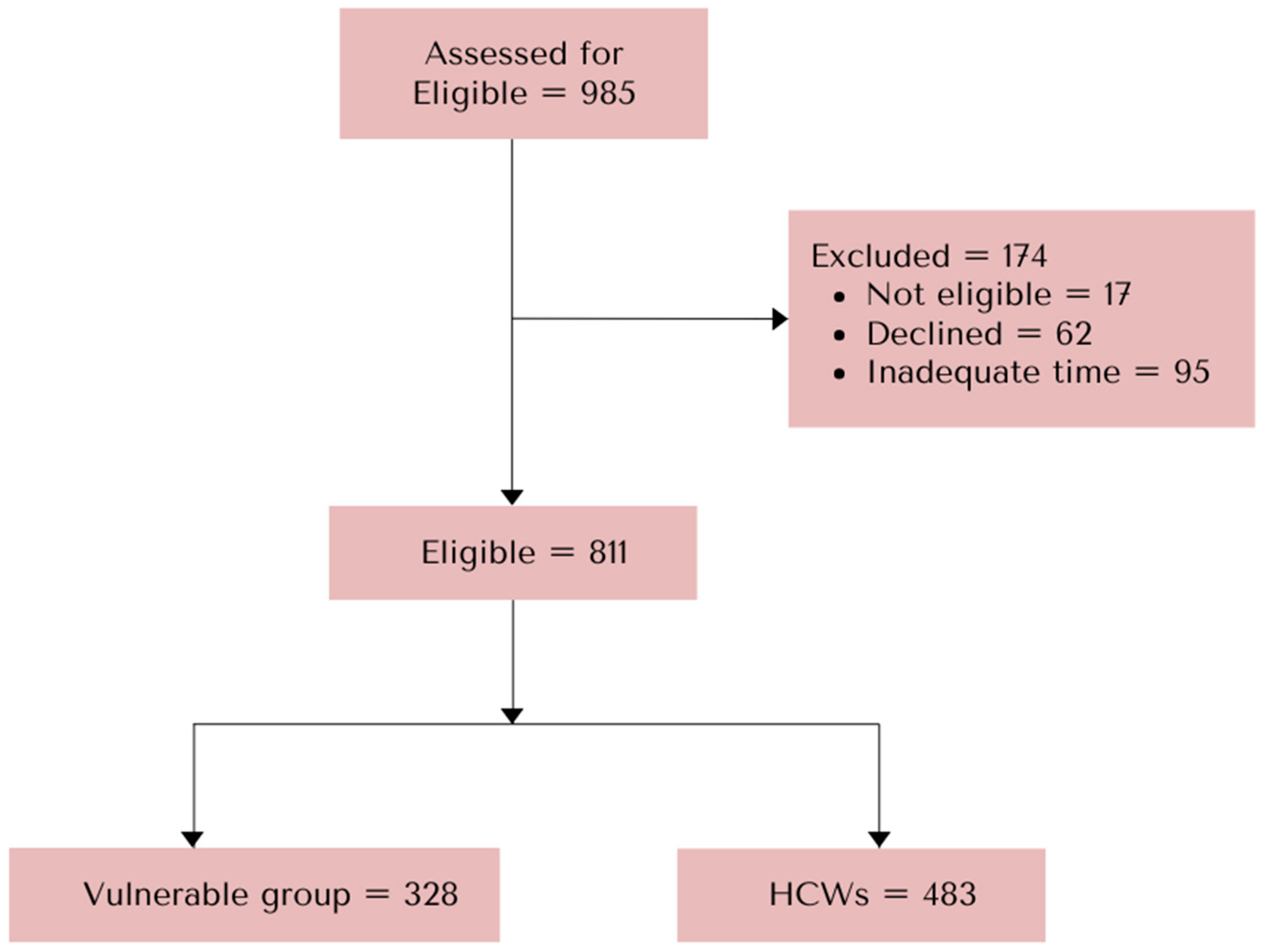 | Parameter | Total n (%) | Vulnerable Population n (%) | Healthcare Workers n (%) | p-Value |